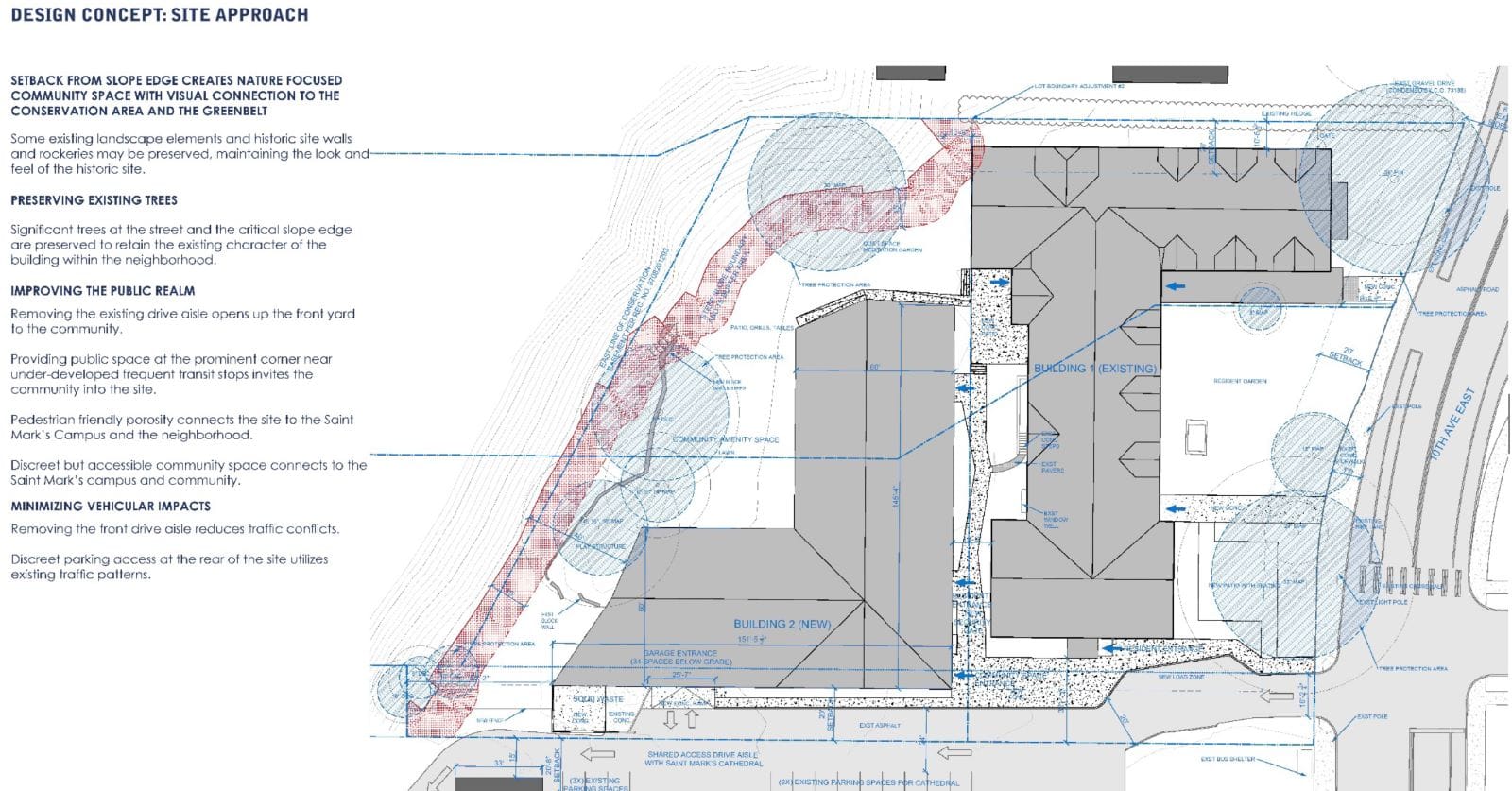 The preservation route would involve the removal of at least eight trees which now stand between the parking lot and the 1950s addition, but it would retain the gargantuan ones along the street and along the slope at the back of the lot. Pedestrianizing the front of the building while retaining the brick walls, stone arches, and significant tree cover are all seen as means of contributing to the sense of community St. Mark’s hopes to foster with this development.