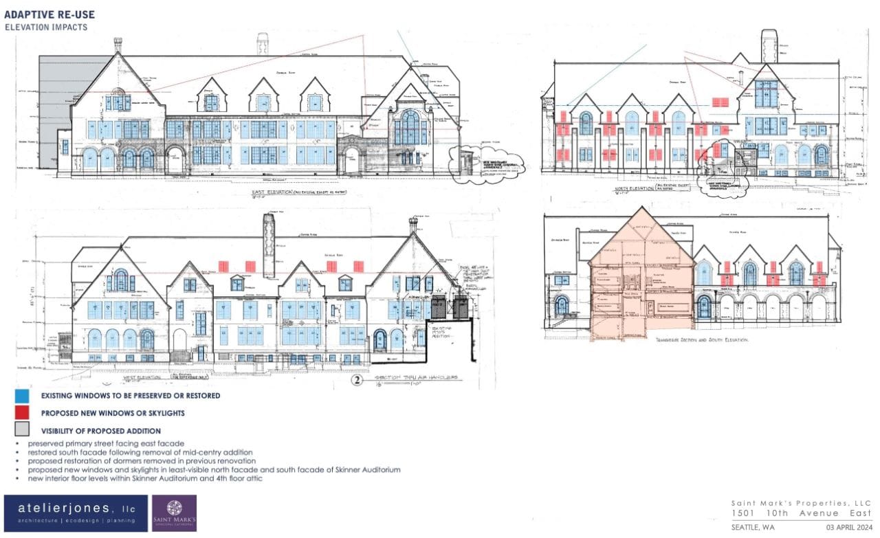 This “Adaptive Re-Use + Addition” plan would provide 119 units, while preserving the historic St. Nicholas structure by converting it to host affordable housing. The plan requires approval from the Landmarks Board pursuant to Seattle’s land use code, and St. Mark’s has met with the board to receive input on how to ensure the project is acceptable. More formal approval will come after a developer is able to commit to the project and more specific plans are finalized.