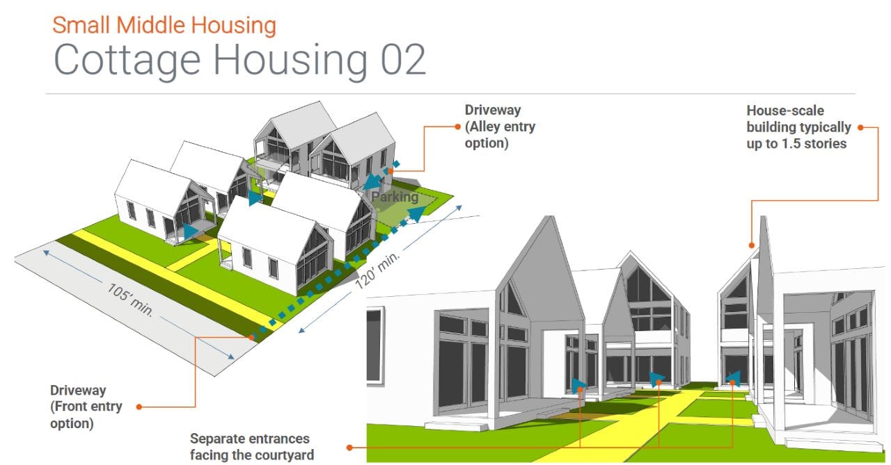 - Offering density bonuses for cottage housing. Commerce says that cottaging housing units should only be counted as half a unit when calculating density limits, essentially offering a two-for-one bonus.