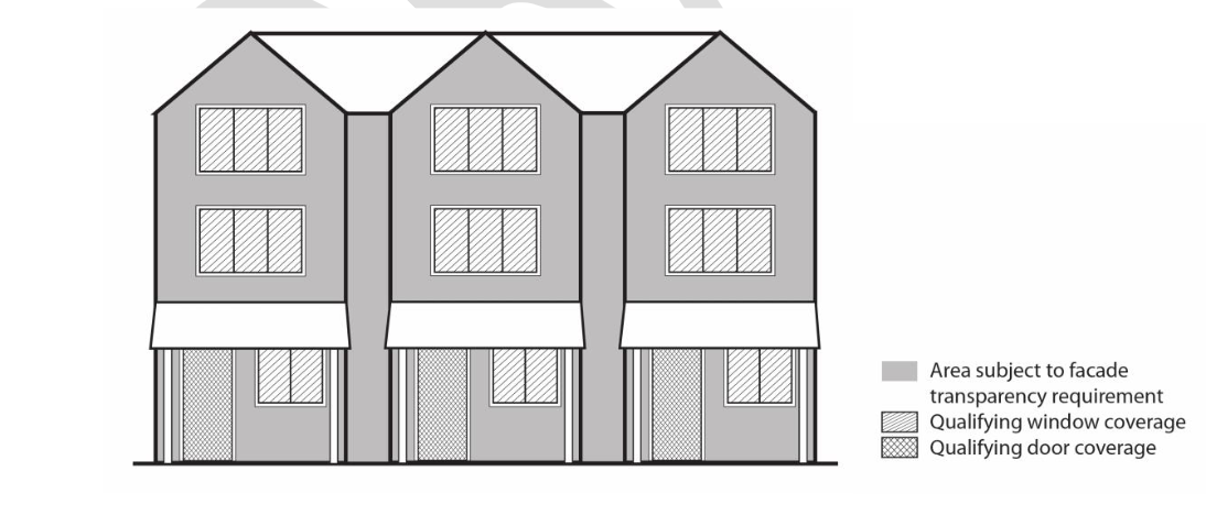 The model codes also contain design standards that apply to middle housing, except for small conversions of existing structures to middle housing. The design standards are focused on having prominent building or unit entries with weather protection as well as windows and doors on street-facing facades reaching 15% coverage. Design standards also call for pedestrian access to sidewalks, de-emphasizing garages, and articulation strategies for attached homes (e.g., roofline changes or dormers, balconies, bay windows, or offset facades).