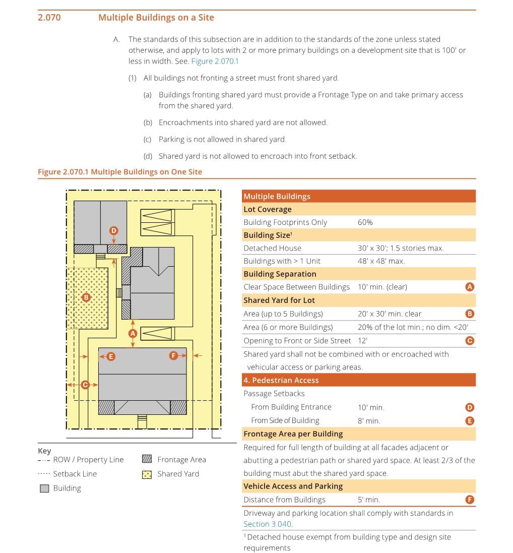 - The toolkit increases barriers for sites with multiple buildings on a single site, which would render many currently popular types of middle housing, such as detached townhouses, cottage clusters in Residential Small Lot zoning, and arguably even detached accessory dwelling units nearly impossible to build on compact urban lots.