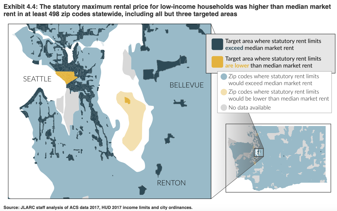 As AMI has risen, rental costs have increased as well. The result is that in 2017, the most recent year JLARC was able to analyze, almost all statutory maximum rental prices for low-income households were higher than median market rent. Downtown Seattle, Downtown Tacoma, and Mercer Island were the only exceptions found in the state.