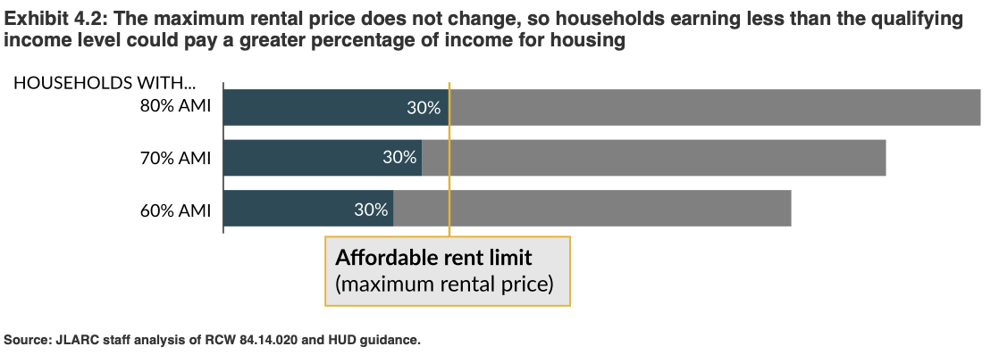 Unlike affordable public housing offered through United States Department of Housing and Urban Development, in which rents are adjusted so that tenants pay no more than 30% of their monthly income on rent, MFTE rents remains the same for across qualifying households in different income brackets. Since most affordable units are designated for households earning up to 80% AMI, households that earn less may end up paying a greater percentage of their monthly income on housing.