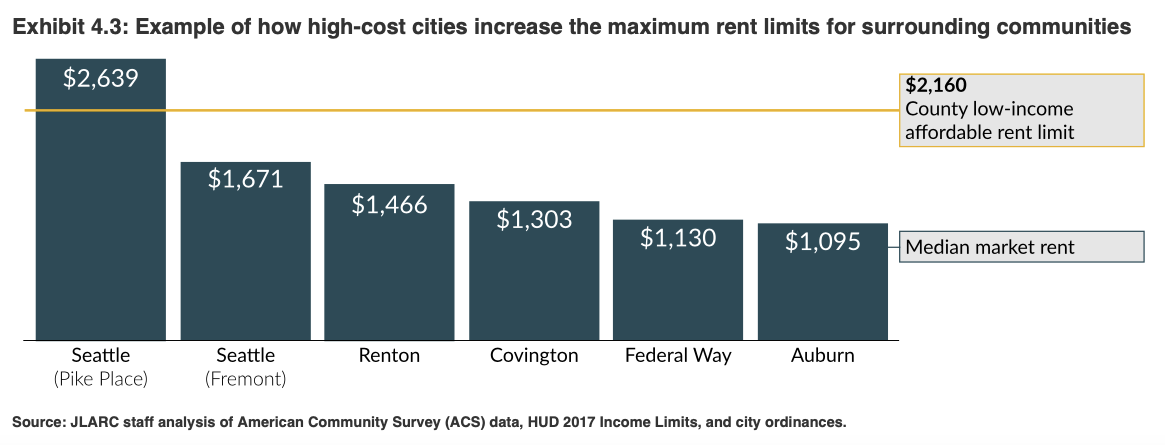 Rising AMI also has a cost increase effect on MFTE housing in nearby lower cost areas. Using 2017 figures, JLARC did an analysis on rental prices in King County. Using the model of a two-bedroom unit rented to a three member household, the consultants found that in some cases, like Auburn, the statutory maximum rent for a two-bedroom “affordable” MFTE unit was actually almost twice as expensive as median market rent for a two-bedroom unit.