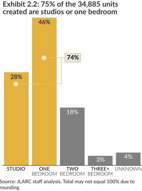 A final weak point for affordability is unit size. Although, the average household size in Washington State is 2.6 people, state law does not limit the type or size of units that may qualify for the MFTE program. About 75% of the units created between 2007 and 2018 are studios or one bedroom apartments. Some cities, including Seattle, have added additional requirements intended to incentivize the production of larger units, such as requiring deeper levels of affordable for SEDUs (small efficiency dwelling units) and increasing the amount of required affordable units in developments that do not have at least four larger (i.e., two-bedroom) units for every 100 units, but such policies appear to have had a negligible impact.