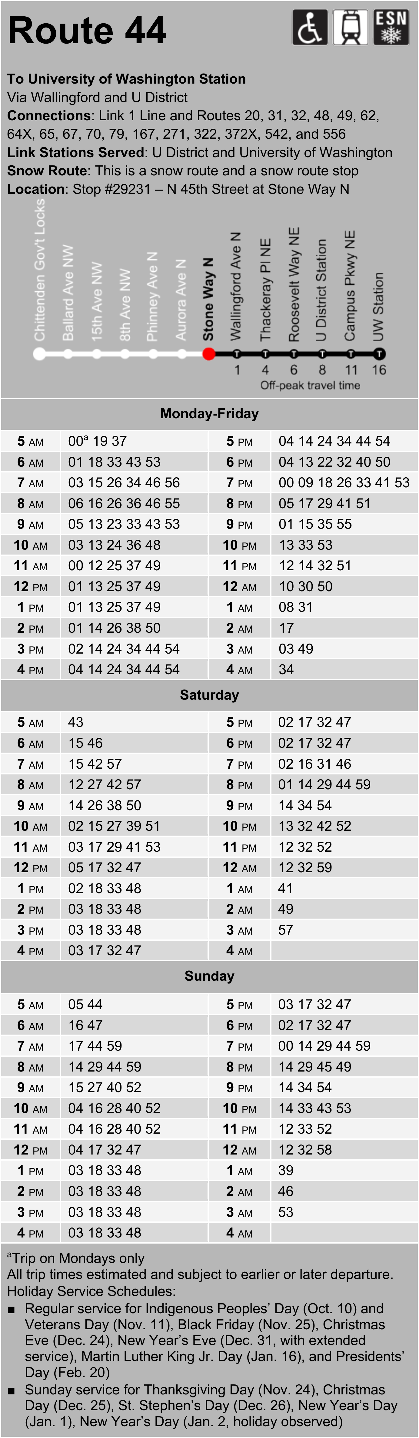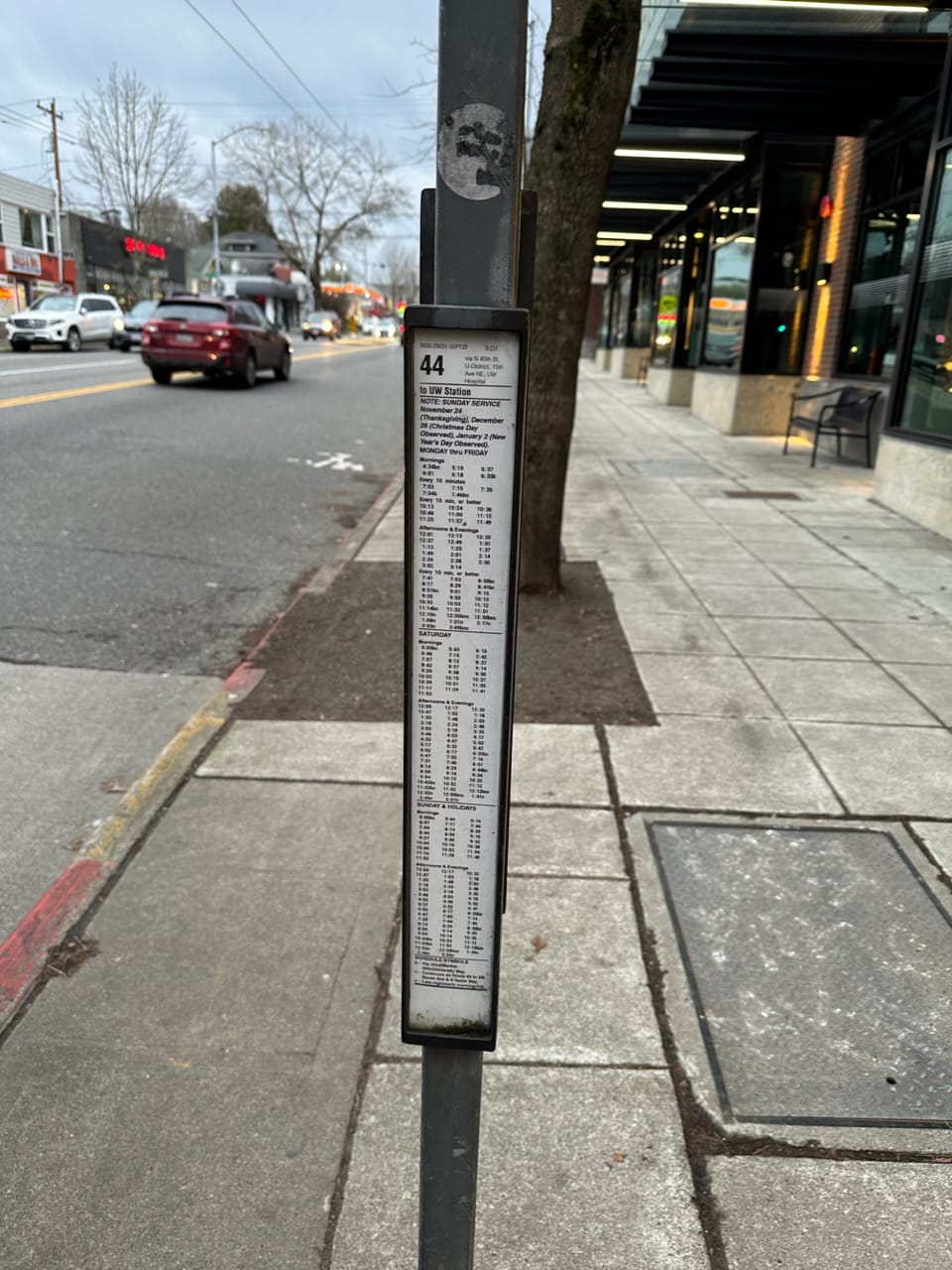 In Puget Sound, transit riders live by schedules. They have places to go and their time is precious. Posted schedules help them make decisions about which options might suit them best and sets their expectations. Local transit agencies understand this and generally offer these in some form at transit stops, but the ones that do exist could use an update to improve their usefulness.