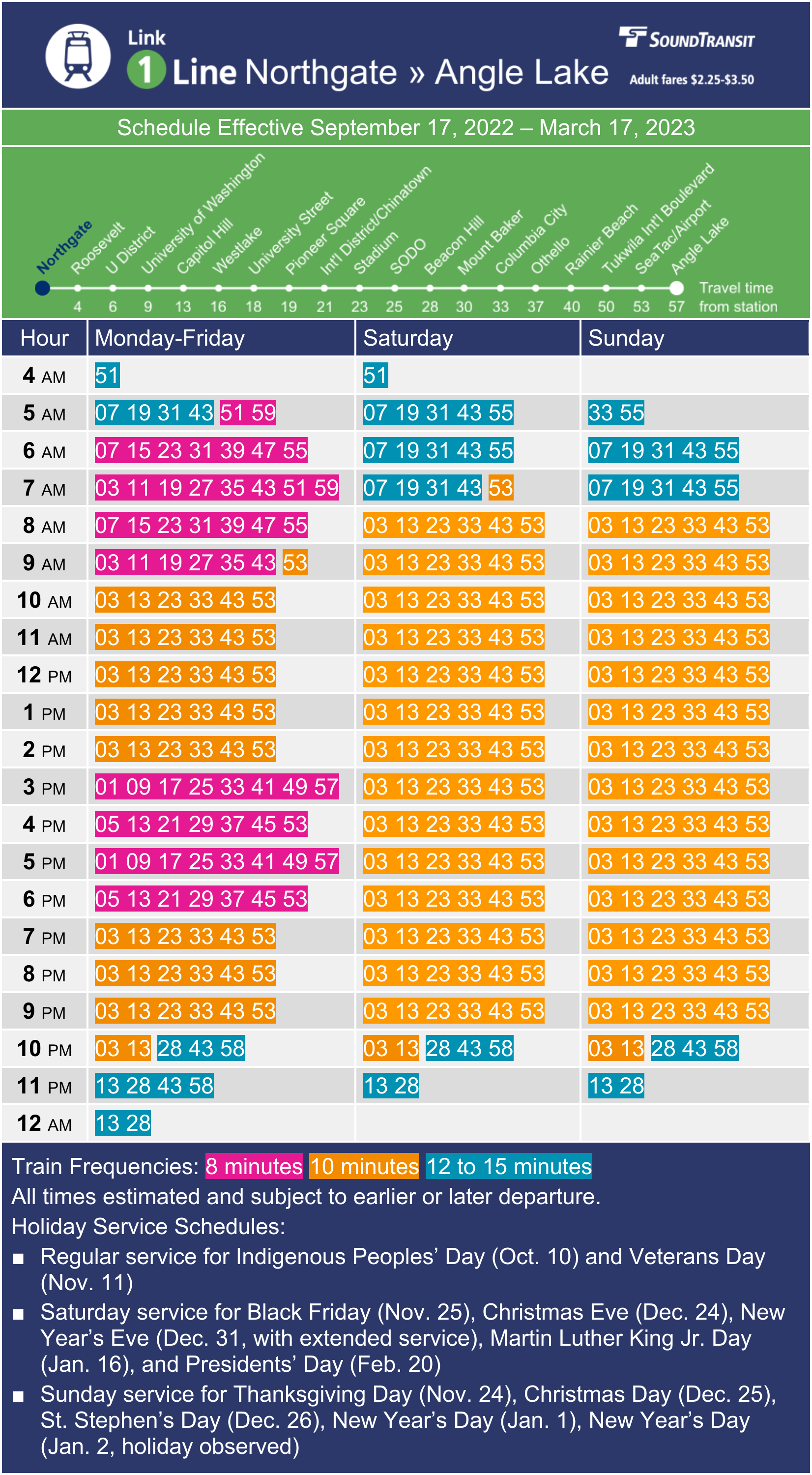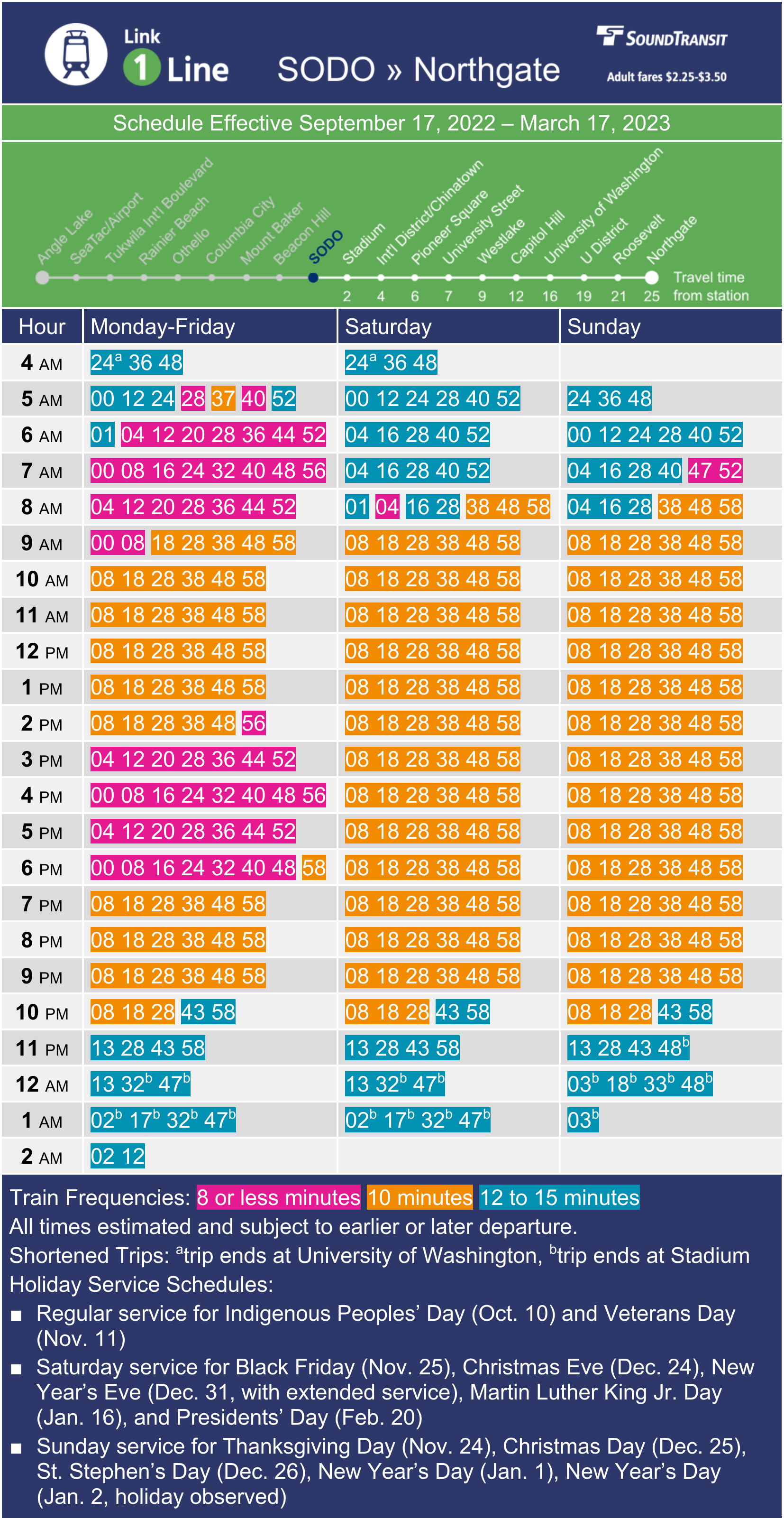 Sound Transit posts what it claims to be Link “schedules” at stations, but these don’t usually tell riders what time a train is actually supposed to depart from a platform. Instead, these schedules generally tell riders what the frequencies are by period of the day. Only a two-minute warning announcement actually lets riders know when a train might be coming. Conversely, Sound Transit’s online timetable offers pages of detailed trip times for the Link 1 Line.
