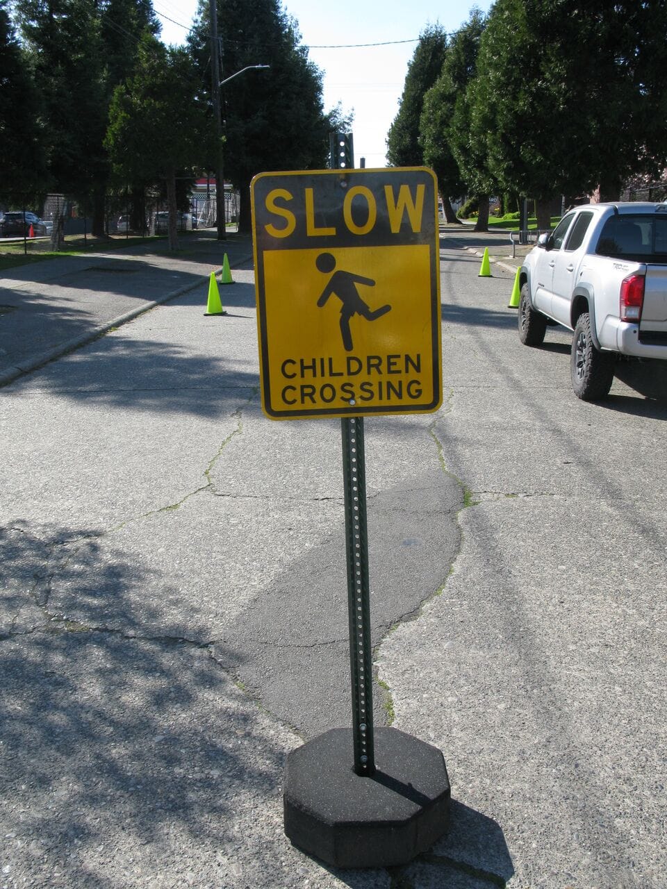 When drivers turn onto NW 58th St to head west and get back to 15th Ave NW, they run into clearly visible road closure and go slow, children crossing signs. The walkway is marked off by traffic cones and signs to signal drivers that they cannot pass.