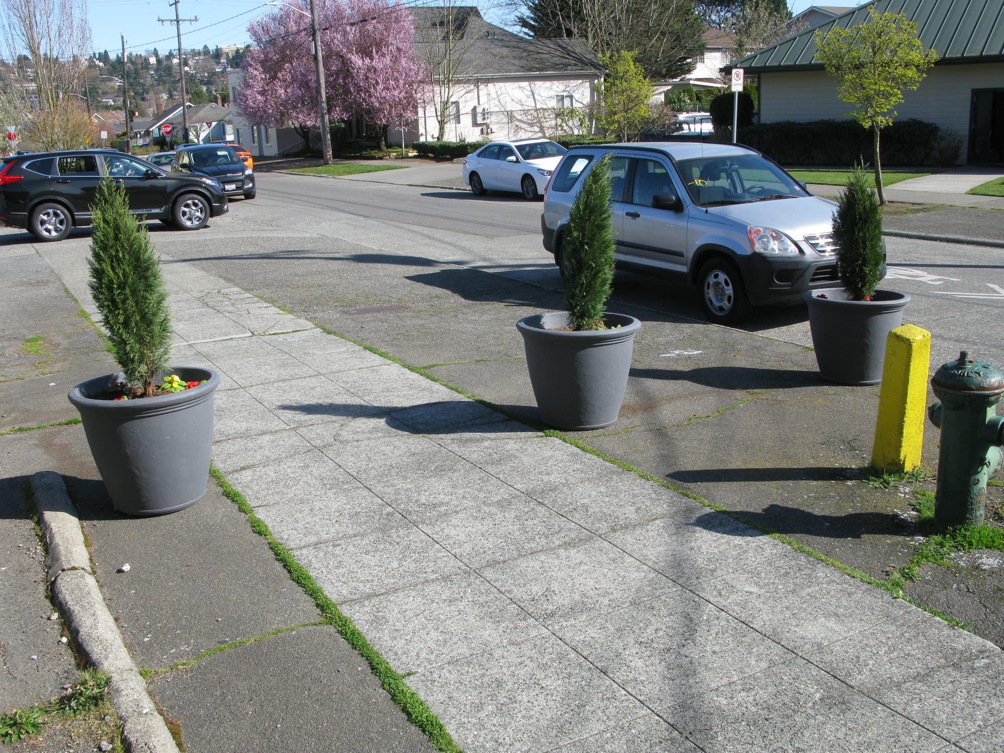 In response, the school officials have upped the ante with something right out of the Janette Sadik-Khan School of Tactical Urbanism. They have placed three large planters between the curb and the school building. This still allows for full pedestrian access but acts as a barrier for rogue car drivers.