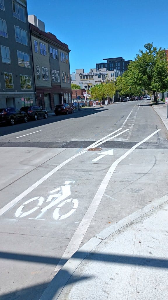 But the brand new bike lane is less than 200 feet long, with street markings at Western Avenue sending eastbound bike riders across a diagonal at a four-way stop onto the other side of the street to head up the hill, and if they continue another three blocks they’ll need to cross back again to get into another two-way bike lane at Occidental Avenue S.