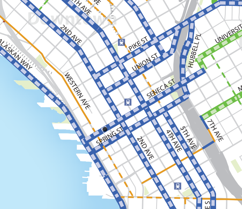Spring Street, on the other hand, does connect through and while the block between First Avenue and Western Avenue is a little steep, it’s less steep than some of the nearby blocks, including further up Spring Street where bike facilities are planned. A two-way bike lane between Alaskan Way and Second Avenue would provide that direct connection to the waterfront bike trail, or if the city needed to get creative they could create the couplet with a connection to Seneca Street on Western Avenue.