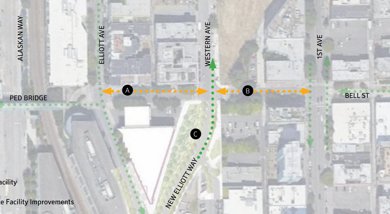 Given the fact that the Office of the Waterfront has been developing these plans as part of the $756 million waterfront project for over a decade, the unfilled gaps speak to the way that providing bike access through the coming multiuse path and bike lanes on Elliott Way has been lip service. The fact that no novice bike rider will be able to connect between these new facilities and the rest of downtown without mixing with traffic speaks for itself.