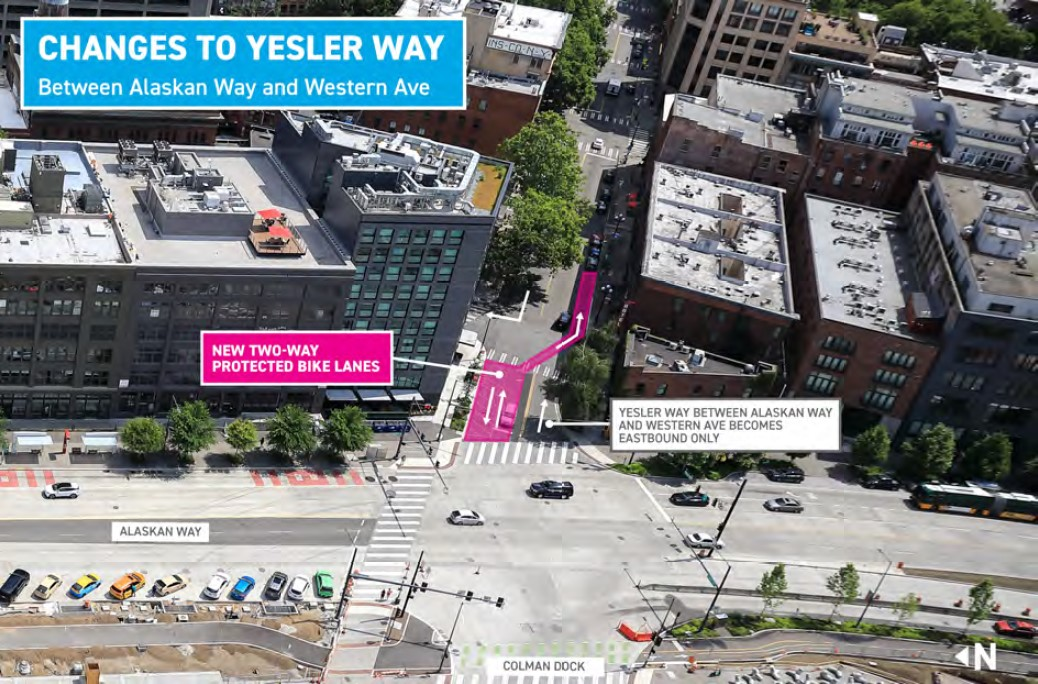 Early last week, crews with Seattle’s Office of the Waterfront installed a very short stretch of two-way bike lane, at the foot of Yesler Way approaching Alaskan Way and Washington State Ferries Colman Dock. The new bike lane was timed to go in at the same time that new traffic patterns around the state ferry terminal were being implemented: Drivers can no longer head west on Yesler past Western Avenue as part of this change.
