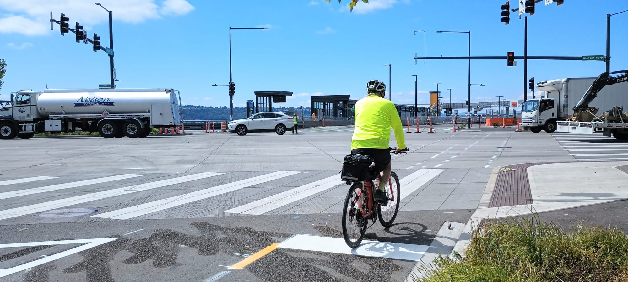 This significant gap illustrates a conspicuous truth about the overall Central Waterfront redevelopment: As work wraps up and the entire corridor is open to vehicle traffic, there is currently no timeline for a fully separated, protected bike lane to go in between the planned waterfront bike trail and the rest of Seattle’s downtown bike network. While the multiple arms of the waterfront project moved forward, decisions on how and where to make these connections were left to another time.