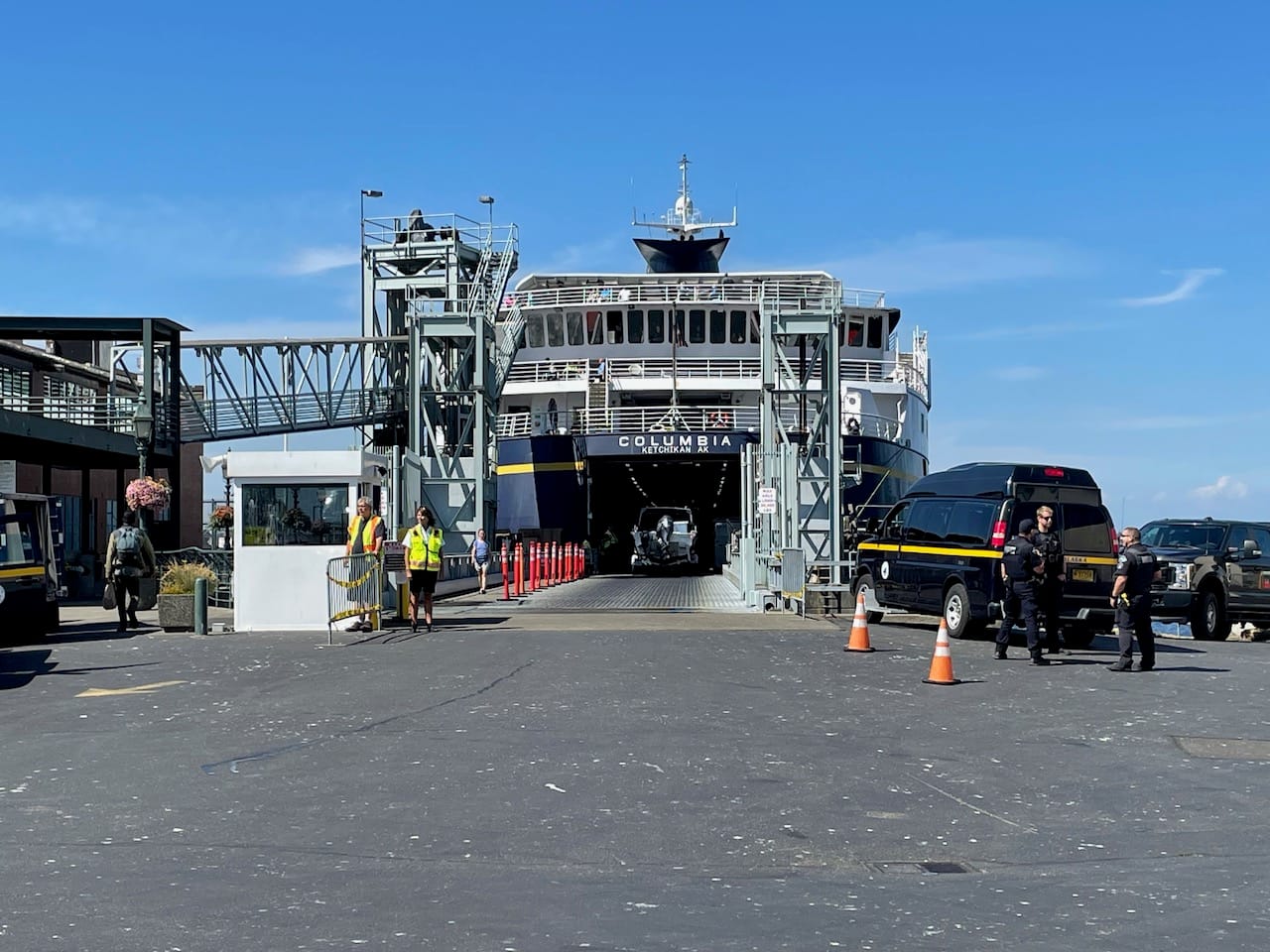 It’s the same, with two exceptions. First, the vehicles headed to Alaska have to go on in the order they’re going to come off, organized by port. Second, there’s no front entrance or exit from the MV Columbia. The front of the boat is, well, boat-shaped. The other docks served by the Alaska Ferry load and unload from the sides of the ship.