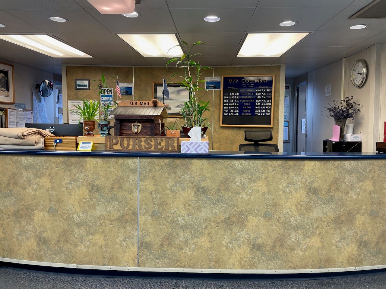 Above the car deck, there are two floors of passenger rooms. Half have two beds, half have four. All are bunks. First task was to find the purser’s desk. I knew the word “purser” existed but never thought it would impact my life in any way. They’re the person on board that handles all the money, and they hand out room assignments. They have a cute little desk at mid-deck on the first floor. It’s also where we set our clocks back an hour, because the ship stays on Alaska time.
