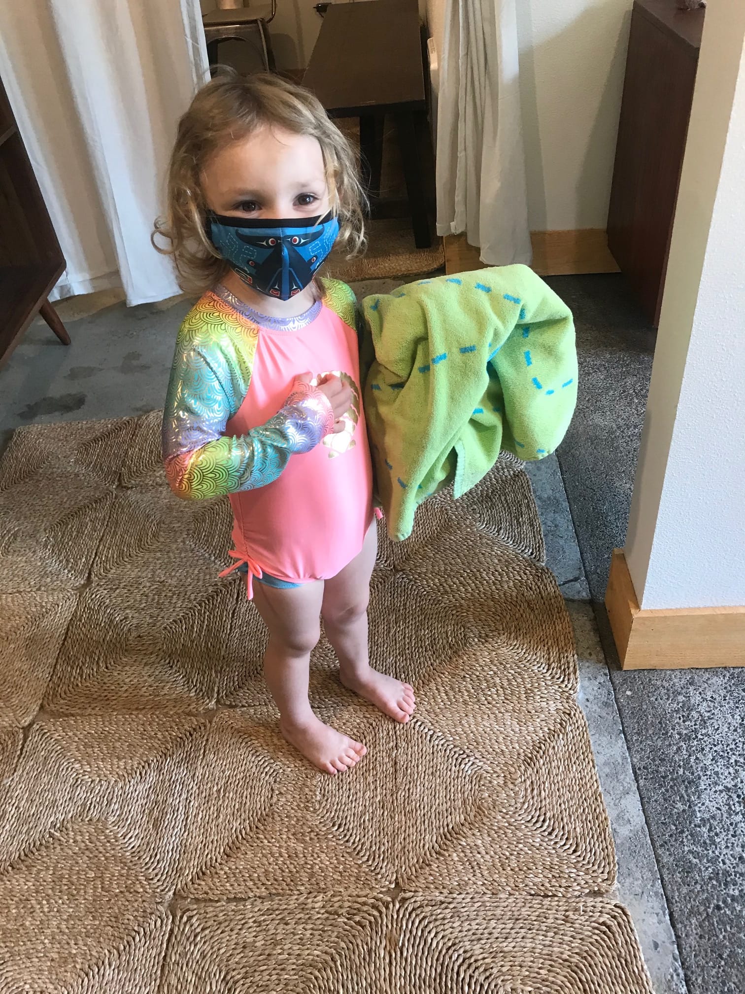 I check the baby monitor that shows the pool area to see the lesson before ours is just getting started. Perfect timing to get her in her swim diaper, which you never want to do too early. (In case you wanted to know) After she peels off her clothes, she runs around naked as I beg her to put on the swim diaper and swimsuit.