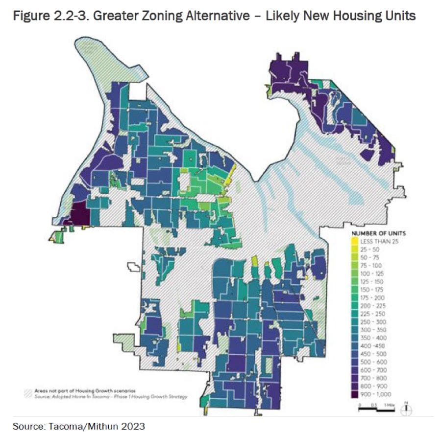 Pierce County’s Vision 2040 plan allocates Tacoma a planning target of 59,800 new housing units and 127,000 new residents between 2010 and 2040. Adding 127,000 new residents to Tacoma’s 2010 population (just under 200,000) would put the city at population just above 325,000. “These allocations are significantly higher than current forecasts and represent a shift in current trends,” the City’s housing element plan notes. Tacoma’s population surpassed 225,000 residents in the state’s April 2024 estimates.