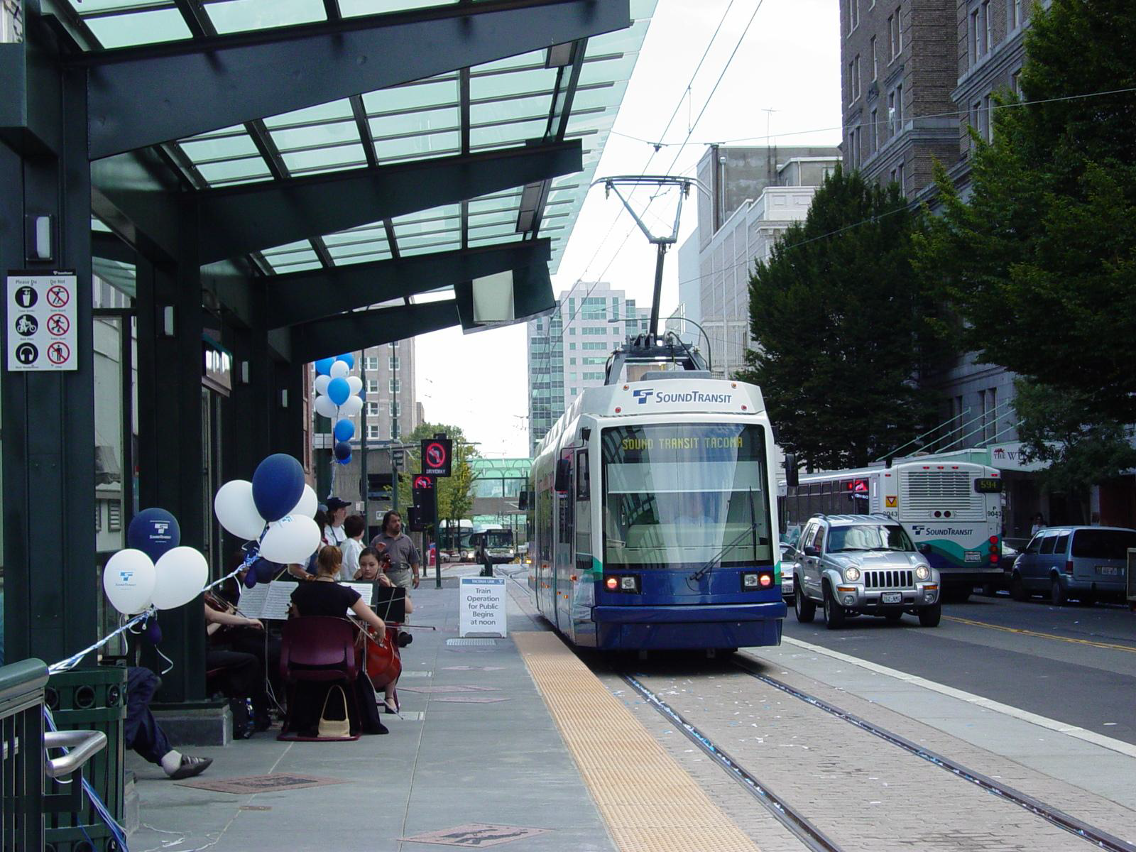 Theater District was one of the original five stations to open with the T Line (then known as Tacoma Link) on August 22nd, 2003 (which, for chronological purposes, I will call T Line version 1.0). Although Convention Center Station was close to many of Tacoma’s major employment destinations, Theater District Station’s location at Commerce and S 9th Streets made it slightly closer to Downtown Tacoma’s core during T Line 1.0’s eight-year run. It opened with a variety of special features that gave a nod to the history of its surroundings, including stone plaques of theatrical posters from the late 1990s and early 2000s; station seating made to resemble fold-up theater seats; theater-style lighting elements; and even a projector that showed a variety of theatrical scenes on the station’s frosted back glass. These unique elements were creative references to the station’s proximity to the Pantages, the Rialto, and the Theater on the Square.