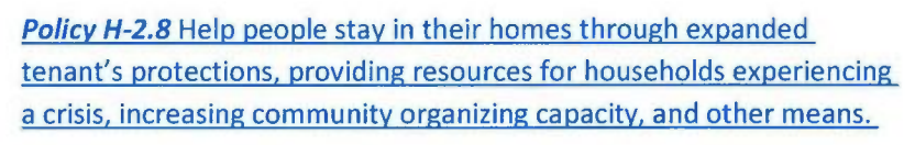 Several other housing policies were included in the Comprehensive Plan update, including policies geared toward tenant protections, economically distressed households, funding housing assistance programs, using inclusionary zoning, and implementing a rental inspection program.