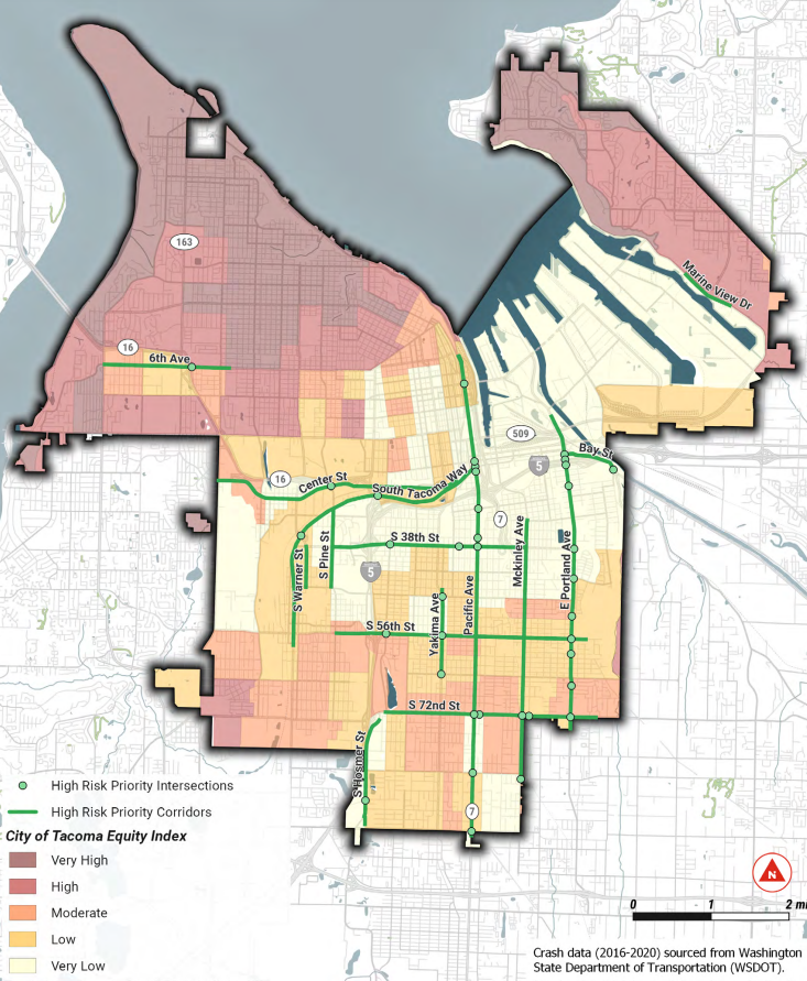 Tacoma’s Vision Zero Action Plan identifies a list of the city’s most dangerous corridors, which are deemed “high risk” due to a history of serious crashes and rampant speeding, where drivers are routinely exceeding the posted speed limit by at least 10 miles per hour. Thanks to a state grant, the City is moving forward with adding pedestrian crossing improvements to a stretch of 6th Avenue included on the list, but a more ambitious “Complete Streets” upgrade to 6th Avenue that would include protected bike lanes remains unfunded. The same is true for upgrades to 72nd and 74th Street in South Tacoma.
