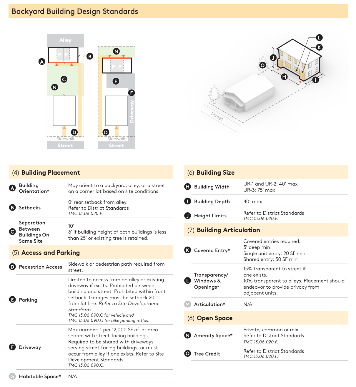 In addition to the development standards noted in the table, Tacoma has developed design standards specific to the different housing types. These generally deal with things like building placement, pedestrian and parking access, building size, building articulation, and open space.