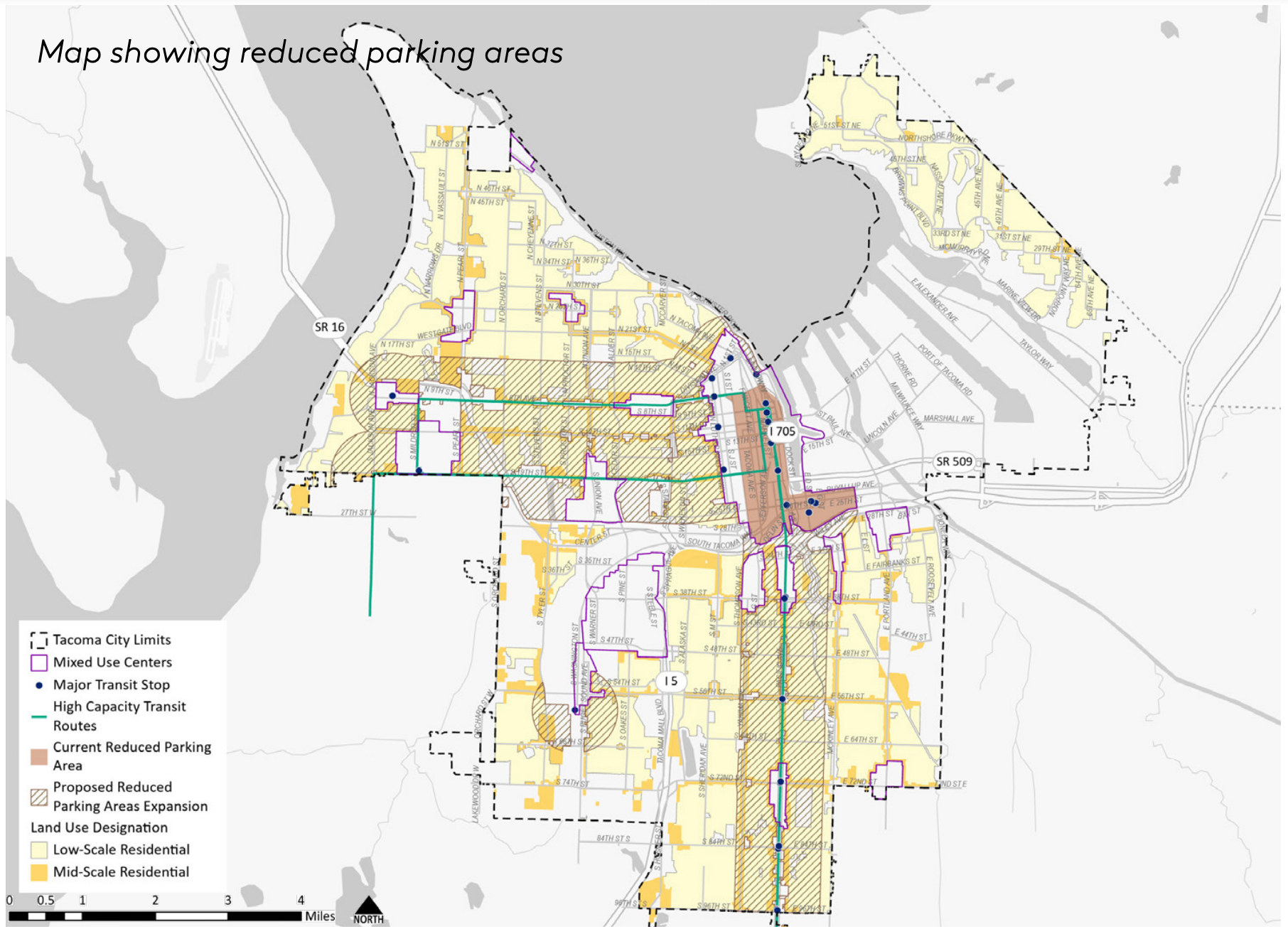 Along with the zoning changes, Tacoma would expand reduced parking areas to comply with House Bill 1110, which preempts car parking mandates within a half-mile walking distance of major transit stops. Full parking exemptions, as contemplated in the proposal, would generally apply along Pacific Avenue/SR 7, 6th Avenue, and S 19th Street where high-capacity transit is planned. Outside of those areas, Tacoma would also make changes to car parking mandates by adjusting them downward to meet HB 1110 requirements and achieve other objectives of Home In Tacoma.