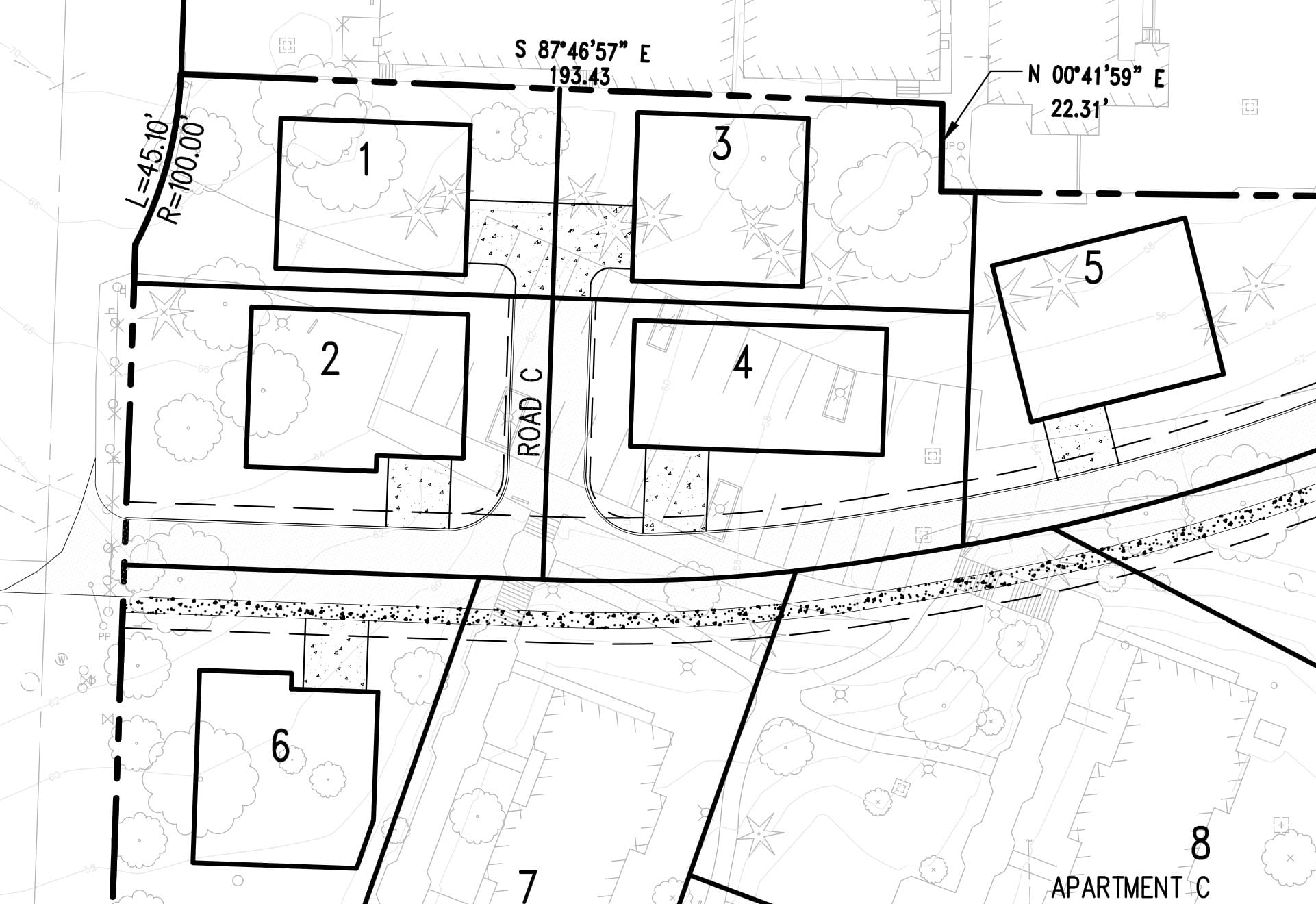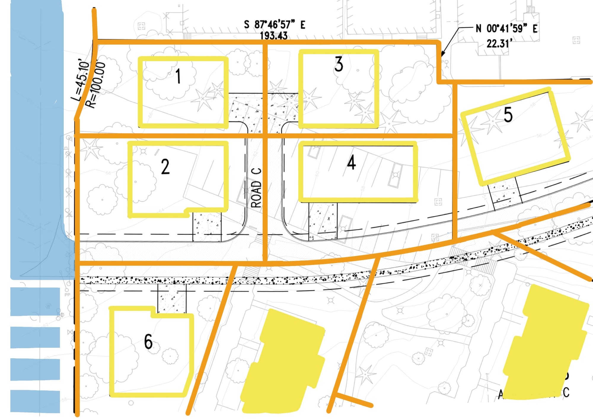 In the southwest corner of the site are HOA parcels and a few lots. Let’s work through highlighting them and see what we can find. Orange property lines, yellow building areas, shades of blue for the public streets and private street easements.