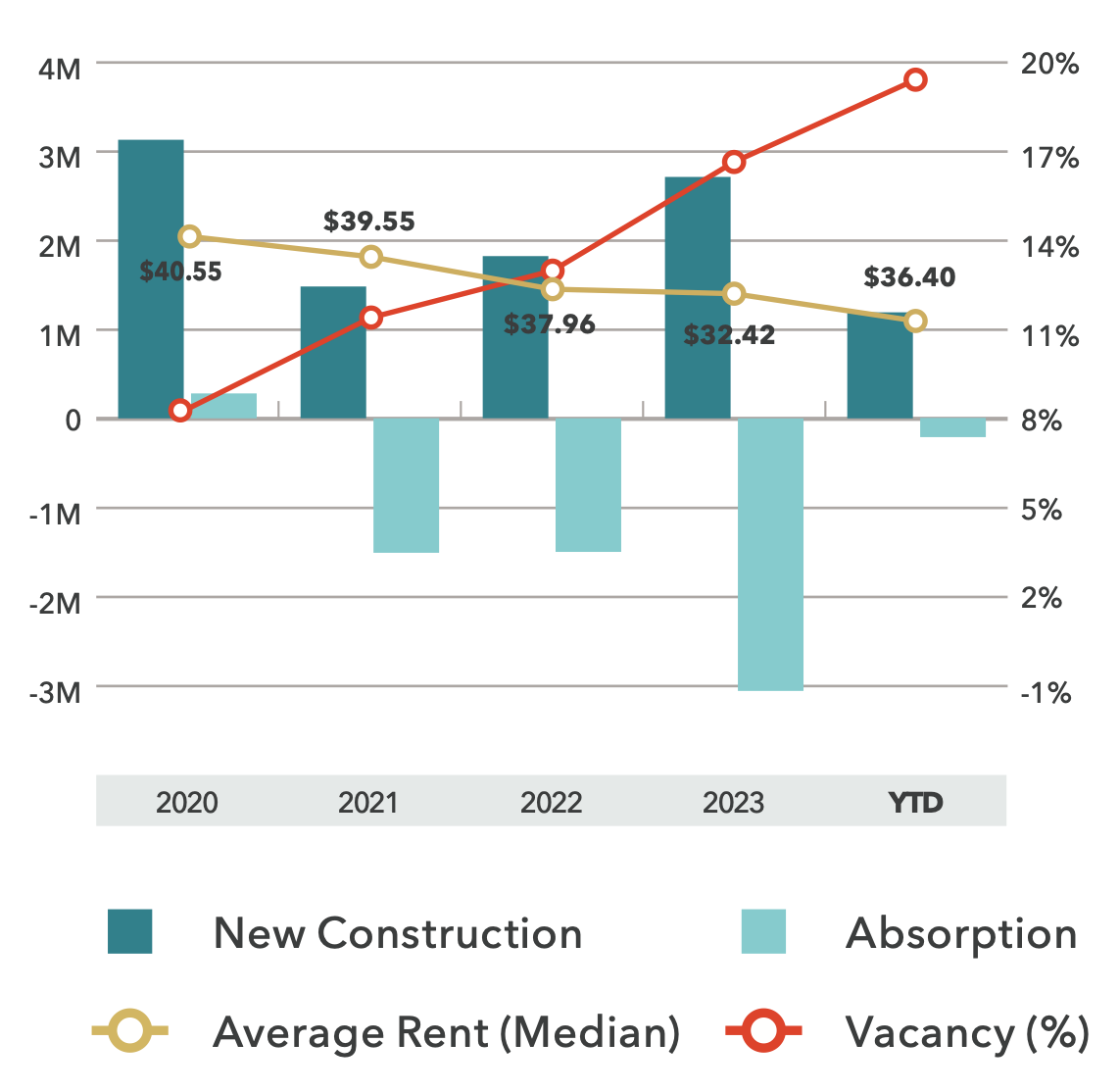 It is important to note that the Kidder Mathews estimates of vacant office space do not include vacant or underutilized office space currently held under lease, and it is unknown how many companies are leaving office space mostly, or entirely, unoccupied as they wait for their leases to expire, a figure that could be substantial. It is possible, however, to measure how office vacancy rates have continued to climb even as office rental prices have decreased, a trend indicating a distressed commercial real estate market.
