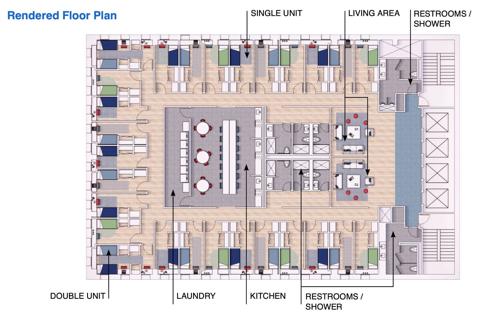 For the study’s purposes, a typical single occupant sleeping room was defined as 120 square feet, and included a twin XL bed, desk and chair, and nightstand along with a microwave and half-sized refrigerator to store personal food and beverage items. Each floor would have about 29 residents and provide those residents with access to a kitchen, dining area, living room, and laundry area. For bathrooms, there would be six single occupant restrooms with showers and three additional toilet rooms per floor.
