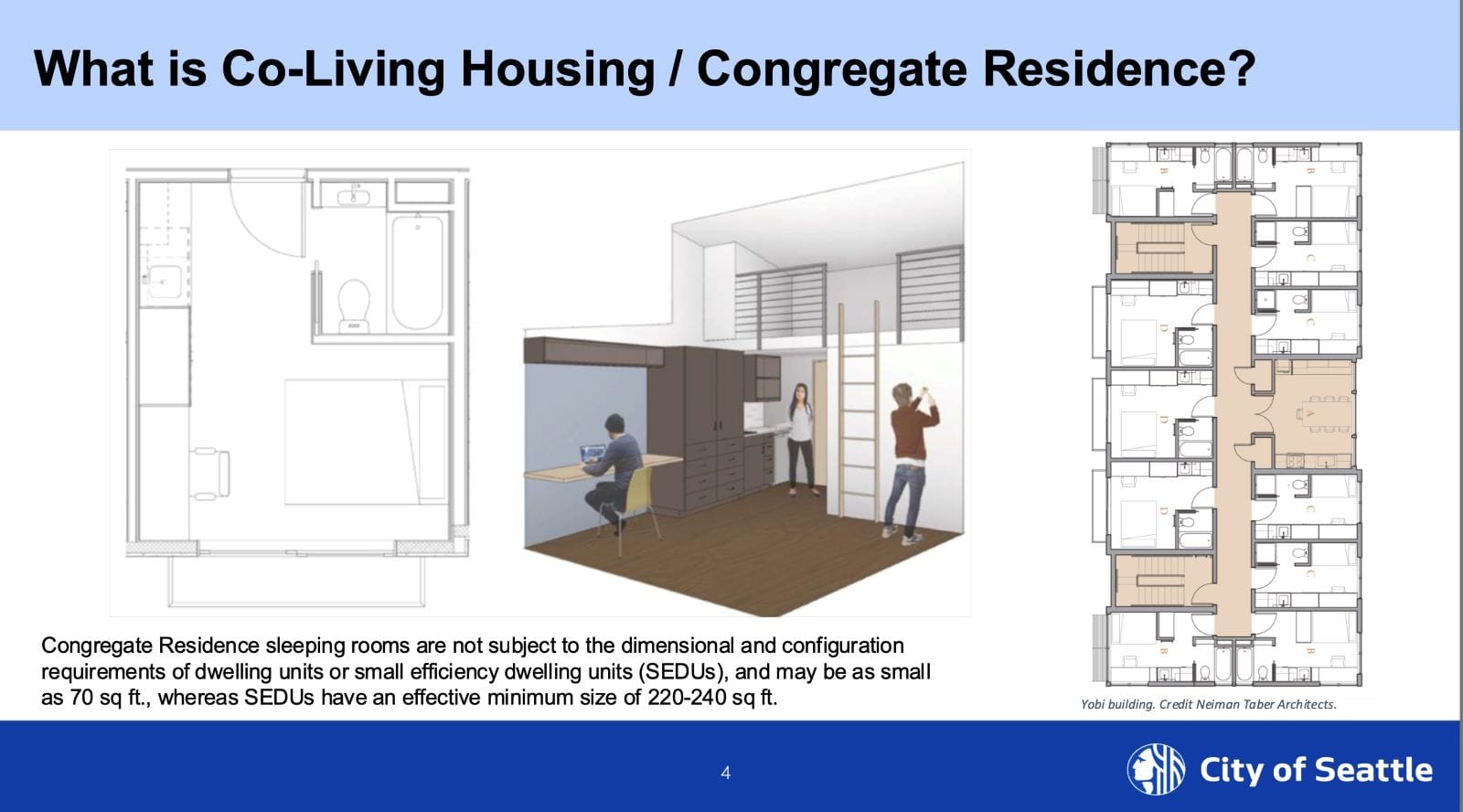 The approved legislation allows for sleeping rooms as small as 70 feet in congregate residences, and exempts them from the design requirements of SEDUs. The definition of congregate residence was amended to describe a residence in which, “sleeping rooms are independently rented and lockable and provide living and sleeping space, and residents share kitchen facilities and other common elements with residents in a building.”
