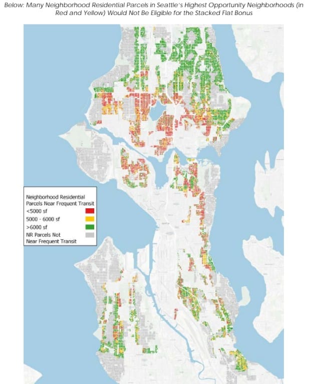 The report recognized that very few lots south of 85th Street meet the minimum lot standards for the stacked flat bonus, banning the pursuit before it can even be tried for almost half of the city in our most transit-rich and walkable neighborhoods. With proposed solutions to state hurdles and relaxing financing concerns, now we just need the City of Seattle to step up and offer better solutions.