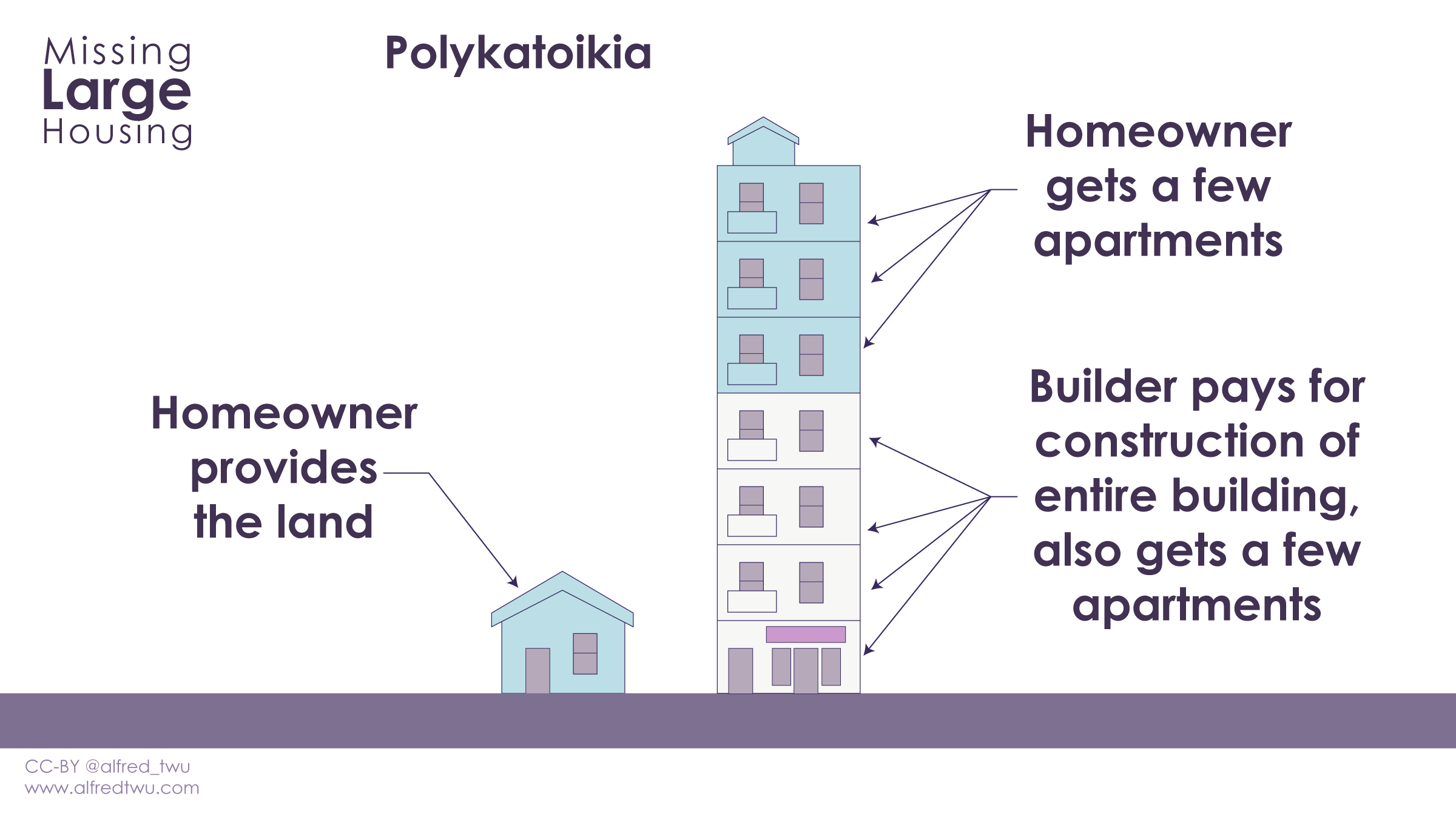 Athens, Greece used to be a city of lowrise, single-story residences in their urban core until the 1920s when they realized their city population was not going to stop growing. People were land rich and house poor. So, what did they do? They partnered homeowners with developers and created one of the most interesting housing swap concepts ever seen. A developer would replace their house with a stacked flat, and give them a home in the new building in addition to some apartments to rent as a tradeoff. The term is Polykatoikia and it is fantastic.