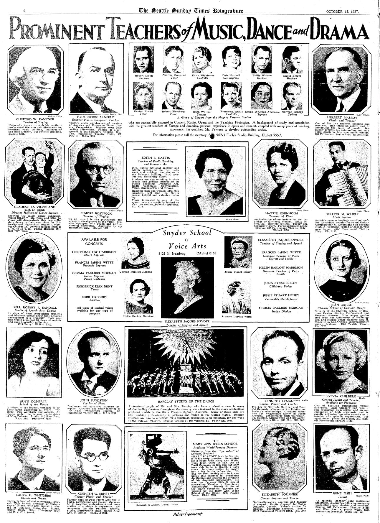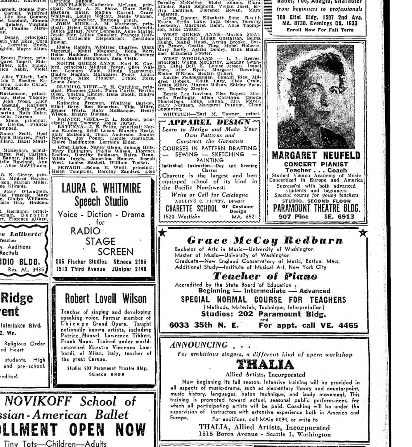 Through the middle of the century, the Paramount’s studio apartments were operating as designed, though it is unclear how many teachers actually resided in the building. Into the 1950s, the Paramount Building appeared in music and acting teachers’ advertisements. From piano to voice to accordion from Walter M. Schlep, the classifieds had a variety of lessons advertised at either 907 or 911 Pine Street or “Ninth and Pine.” A full page circular in the October 17, 1937 Seattle Sunday Times featured “Prominent Teachers of Music Dance and Drama.” Eight were located in the Paramount Building.