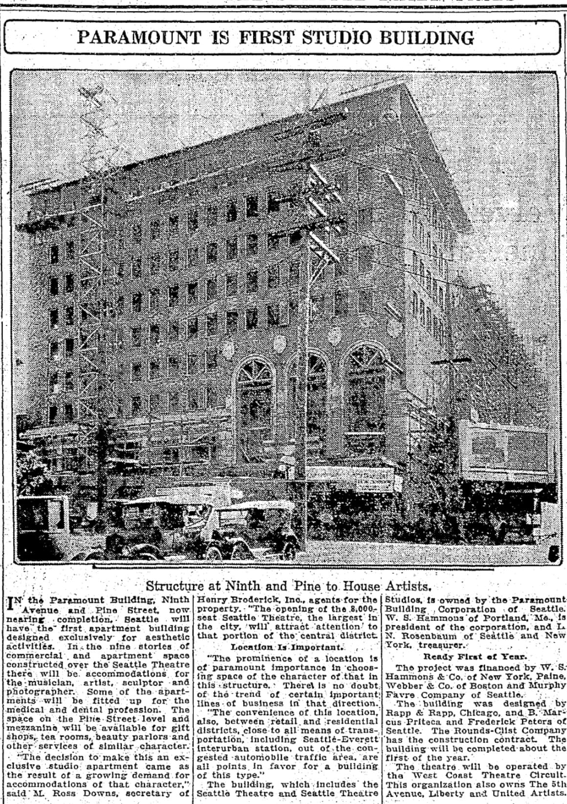 “In the Paramount Building, Ninth Avenue and Pine Street, now nearing completion, Seattle will have the first apartment building designed exclusively for aesthetic activities,” the Seattle Daily Times announced in an article on October 23, 1927. “In the nine stories of commercial and apartment space constructed over the Seattle Theatre there will be accommodations for the musician, artist, sculptor and photographer.”