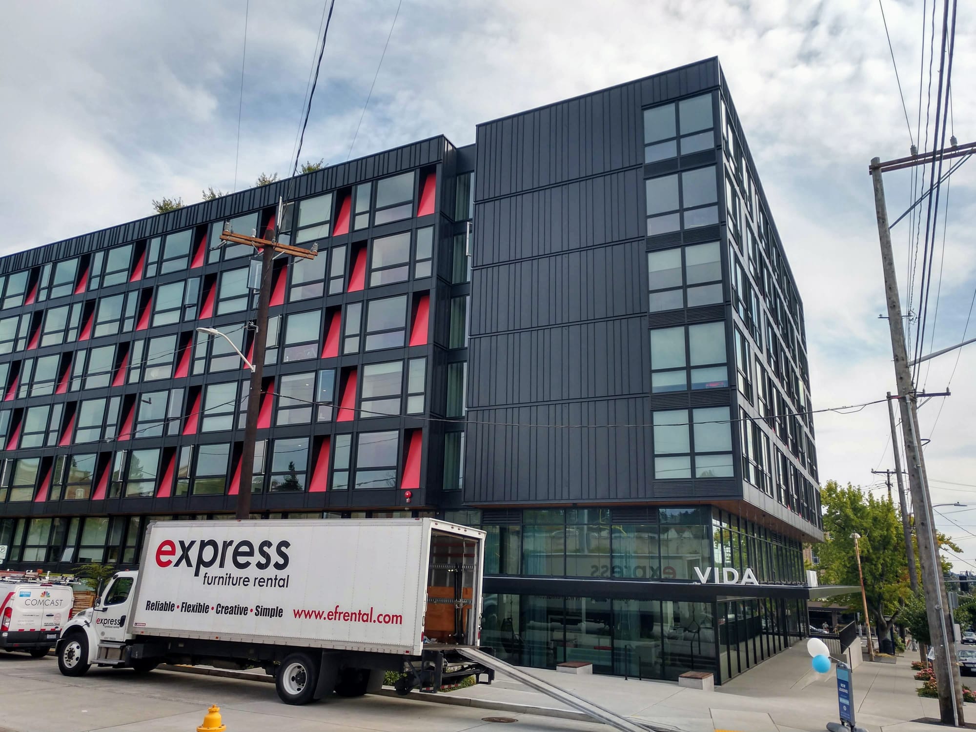 Projects like The Rooster (196 homes) and Eleanor Apartments (260 homes) signaled the arrival of the Roosevelt boom–completed in 2015 and 2016, respectively. Recently projects like Iron Flats (with 289 homes) and the just completed Vida Apartments (201 apartments) are continuing the building spree. Vida also brings an iconic design, with fuchsia accents on a modernist facade right outside of the station’s east entrances. Plenty of small- and medium-sized projects are filling in the gaps too, with 78 small efficiencies going in on NE 66th St, for example.
