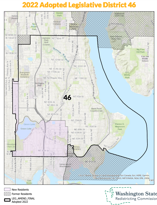 The 46th changed significantly in redistricting. It’s now contained entirely in Northeast Seattle after dropping Lake Forest Park and Kenmore from its borders. This change is due to the fast growth rate of Seattle compared with the rest of the state over the past decade. The 46th also lost Laurelhurst and picked up the Ravenna, Roosevelt, Green Lake, and Wallingford neighborhoods, plus a slice of Aurora. The district is expected to lean more progressive now that it’s fully located within Seattle.
