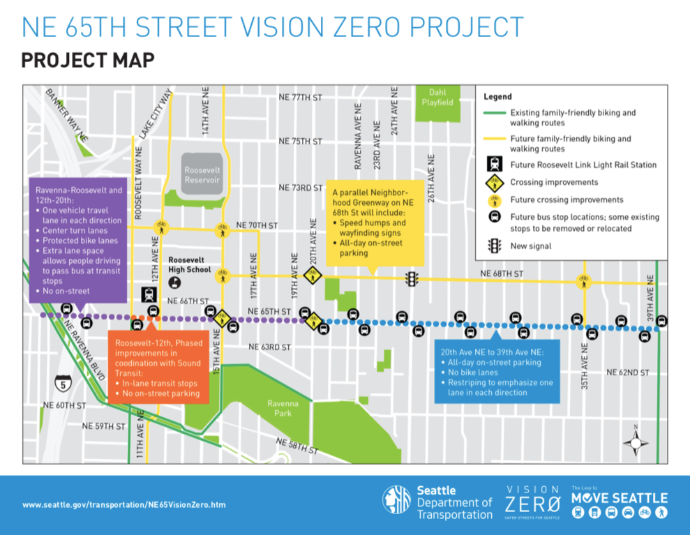 The most recent Move Seattle Levy report shared that the NE 65th Street Vision Zero Project is almost complete. The project includes a variety of safety improvements that will make it safer for pedestrians and cyclists to access the future Sound Transit Roosevelt light rail station, opening in 2021. A parallel Neighborhood Greenway on NE 68th Street is currently in design.
