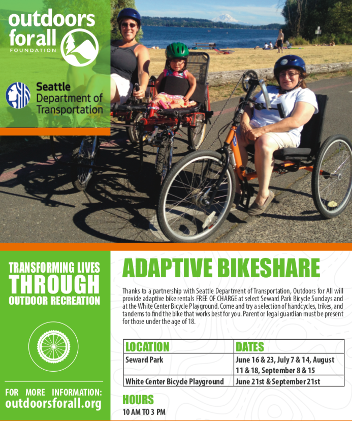 Finally, local nonprofit Outdoors for All has partnered with SDOT to provide free adaptive bike rentals at Magnuson Park all summer. Outdoors for All will also be bringing the free adaptive bike rentals out to for people to enjoy at Seward Park and the White Center Bicycle Playground on selected dates.