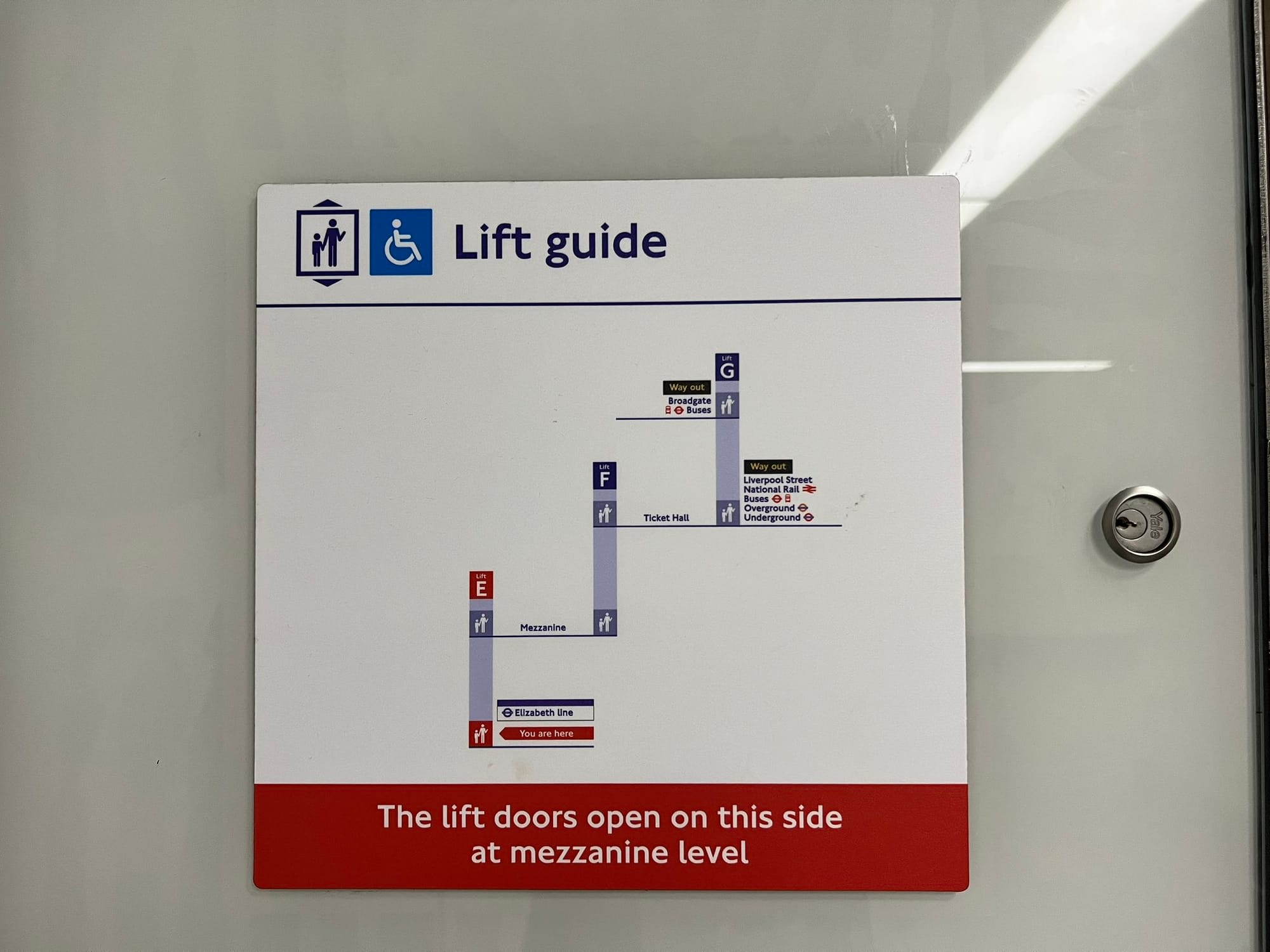 To reassure riders of options at Liverpool Street, signage above the Lift E doorway indicates that the rider can reach the station exit as well as National Rail, London Buses, London Overground, and London Underground services. Similar information is provided at the Elizabeth line platform with wall signs. Connecting services are indicated with directional arrows and elevators are given a special level of detail for which are best to reach specific platforms.