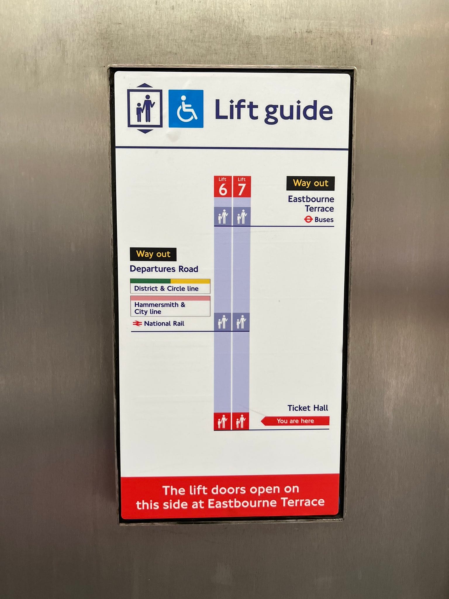 Another ingenuity in London: elevator network guides. At many stations, all elevators are given a unique number or letter emblazoned above their thresholds. Along with these are placard guides placed to the side and inside of elevators diagraming the relationship of elevators throughout a station or station complex. Those diagrams can be quite detailed, offering information on which floors elevators connect and which side the elevator doors will open.