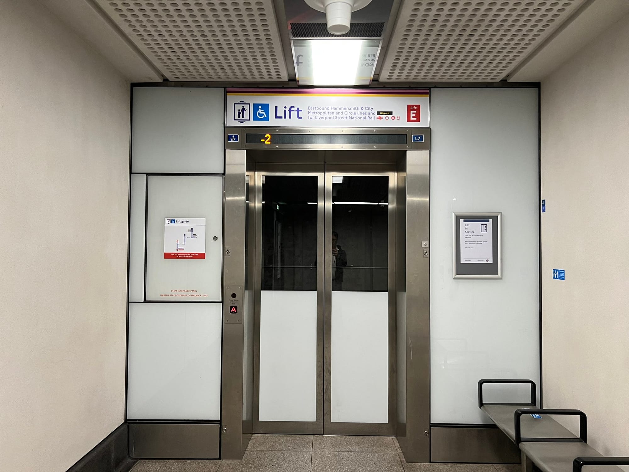Want to go from the Elizabeth line to one of the London Underground lines at Liverpool Street? Take Lift E to the mezzanine floor and then Lift F to the ticket hall. From there, additional guidance will be offered. In a more complex situation, a rider may want to reach Broadgate. The elevator guide would direct the rider to similarly take the same elevators to the ticket hall but then ride Lift G to the Broadgate level.