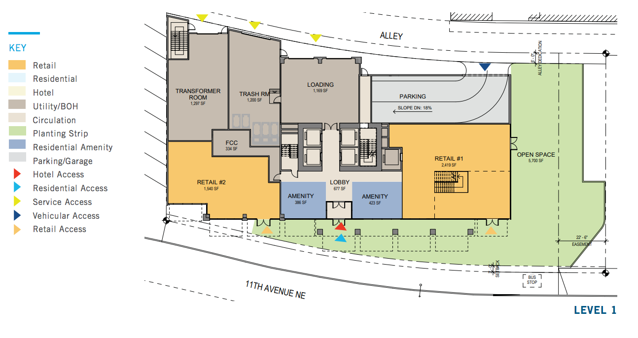 The project responds to several of the new U District guidelines. Brooklyn Ave is a Green Street and so is singled out for special treatment such as a greater set back and more greenery. This gives some early hints about what is in store for the U District and hopefully some of the public benefits to come with the new development. Additionally, as part of the U District upzone the site was granted a base buildable area (based on a ration of the lot area) and then further commitments to provide public goods are needed to reach the maximum buildable area. Sixty-five percent of the additional building potential is obtained through providing the required Mandatory Housing Affordability–the project will either pay $20 per square foot into the housing fund or make 9% of their units rent restricted. The remaining 35% is provided as a bonus for providing additional street setback, Green Street Improvements and providing the public open space on the north end of the site.