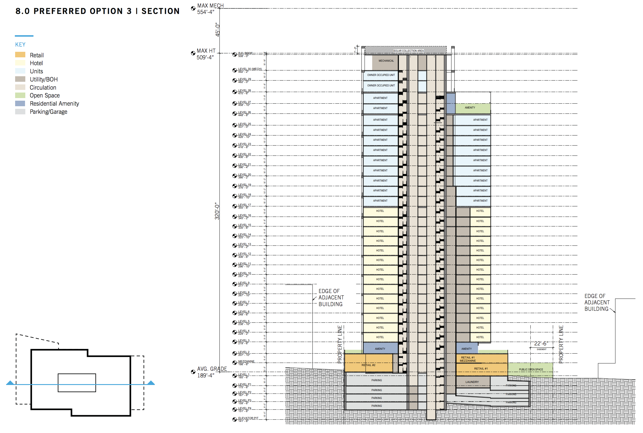 As the section above shows, they propose putting the hotel on the lower levels and saving the upper levels and the views that go with them for the apartments. Residential amenity areas are located on the ground floor and on terraces above the retail and at the upper level setback.
