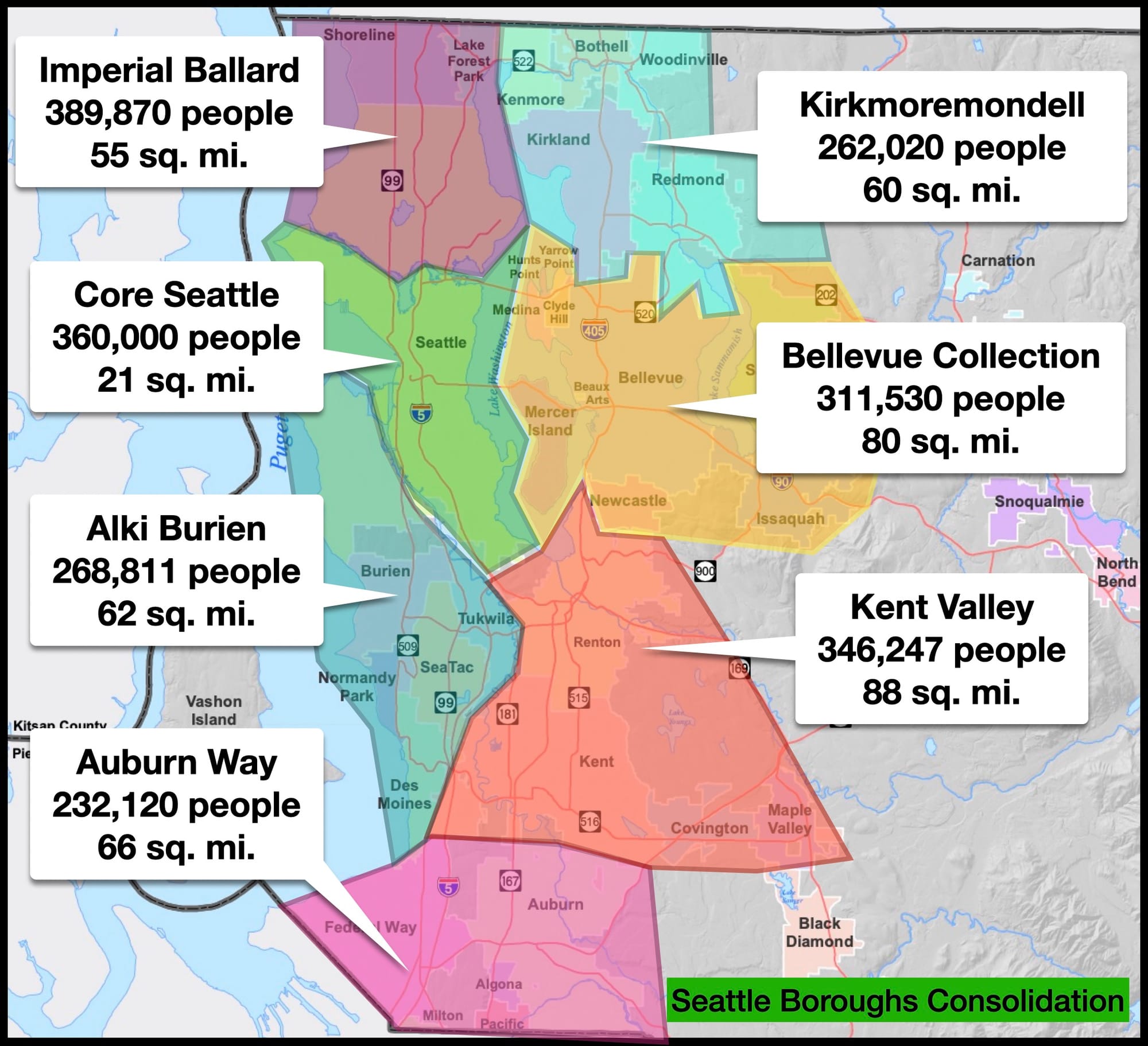 To borrow the term from New York, a borough arrangement could see Core Seattle standing on its own in a similar position to Manhattan. West Seattle could join the jurisdictions running between I-5 and the Sound from Alki through Burien. And Ballard could become the Nordic empire it was always destined to be, north of the Ship Canal separating from Downtown and joining Shoreline. With between 250,000 and 350,000 people each, seven boroughs creates a weirdly balanced map.
