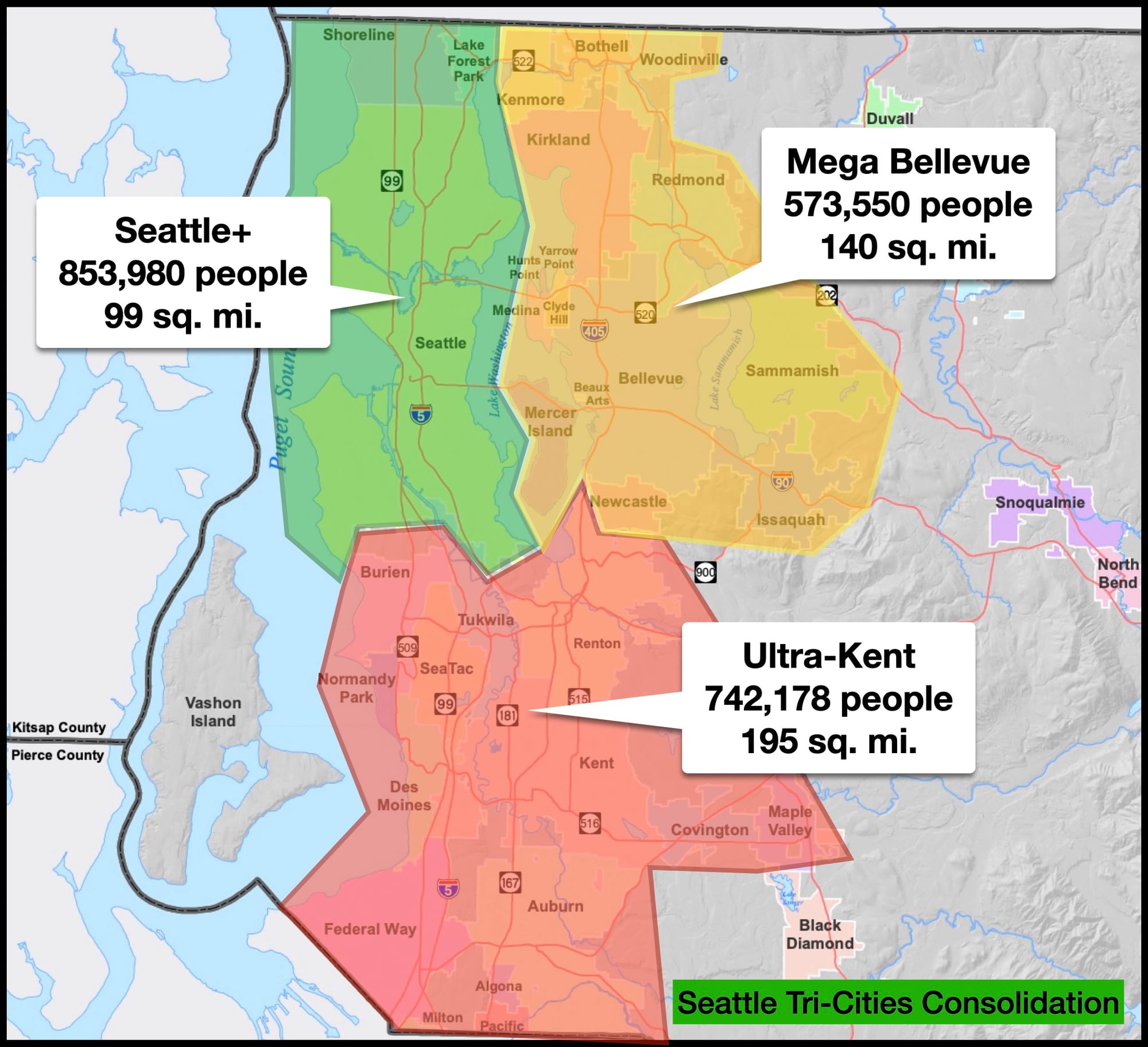 The first potential city consolidation concept is the simplest: three cities around Lake Washington. Merge cities into Mega-Bellevue to the east, an expansive Ultra-Kent to the south, and Seattle+ to the west. Really, such a consolidation accomplishes the biggest goal, wiping out every mini-jurisdiction in an easy swoop. Each of the new cities gets a major piece of infrastructure like the port, the airport, or highways. Each gets a lot of Sound Transit stops. And there is a location of both Dick’s Burgers and Uwajimaya in each new city.