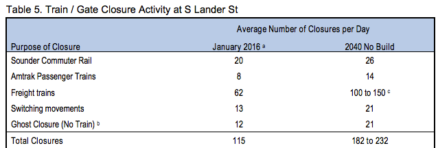 Even with that track record of declining traffic volumes, the projections for 2030 that are used to estimate the impacts of not building the grade crossing still estimate an increase in average daily vehicle traffic volumes. The current plan for Lander does include one fewer lane, four down from five, due to the reduction in traffic since the last study, but the City still assumes a growth rate of 0.4% per year from this year forward. The projections do assume that freight traffic does become a larger percentage of traffic on Lander, increasing at a rate of 1.3% annually. Are these estimates realistic? It’s important to keep in mind that the 0.4% increase is without constructing the bridge, with expected increases in train traffic causing the number of gate crossings to jump from 115 to anywhere between 182 and 232.