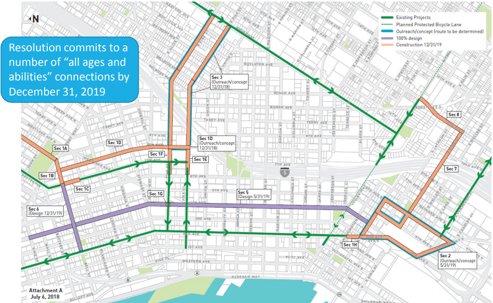 The resolution also calls for design work to be completed on several other center city bike projects. It calls for the city to be at 100% design on the 4th Avenue bike lane (currently set to be constructed in 2021) by next May, and at 100% on protected bike lanes on Bell Street by the end of next year. The resolution also calls for additional traffic calming on the “Bell Street Park” segment of the route between 2nd Avenue and 5th Avenue.