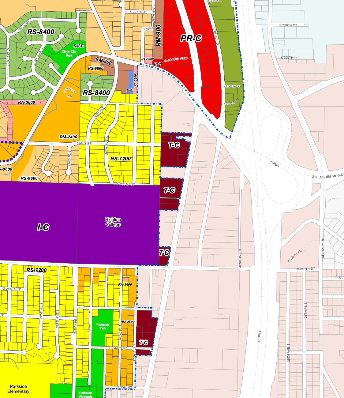 The existence of SR-99 also acts a serious obstacle to areas west of the planned station, but there are efforts to make crossings more bearable. This will be especially important since many light rail passengers will probably be students attending Highline College to the west. Despite the barrier, it does seem that Des Moines has underzoned lands to the west, much of which is exclusionary single-family-only zoning within the station walkshed and bikeshed. The same could be said about Kent east of I-5, though a pedestrian and bike crossing would be necessary to make that more feasible.