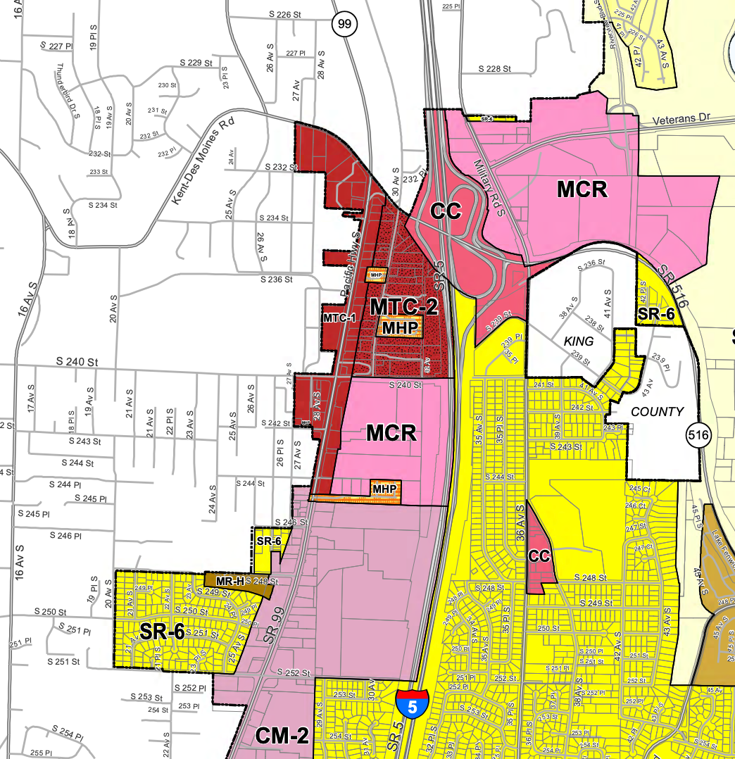 Potential for redevelopment in the area is fairly good north of S 240th Street, but there are serious equity issues given the existence of low-income housing such as mobile home parks. South of S 240th Street, there are also challenges to redevelopment given the location of Lowe’s Home Improvement and unstable parcels of land from the former Midway Landfill.